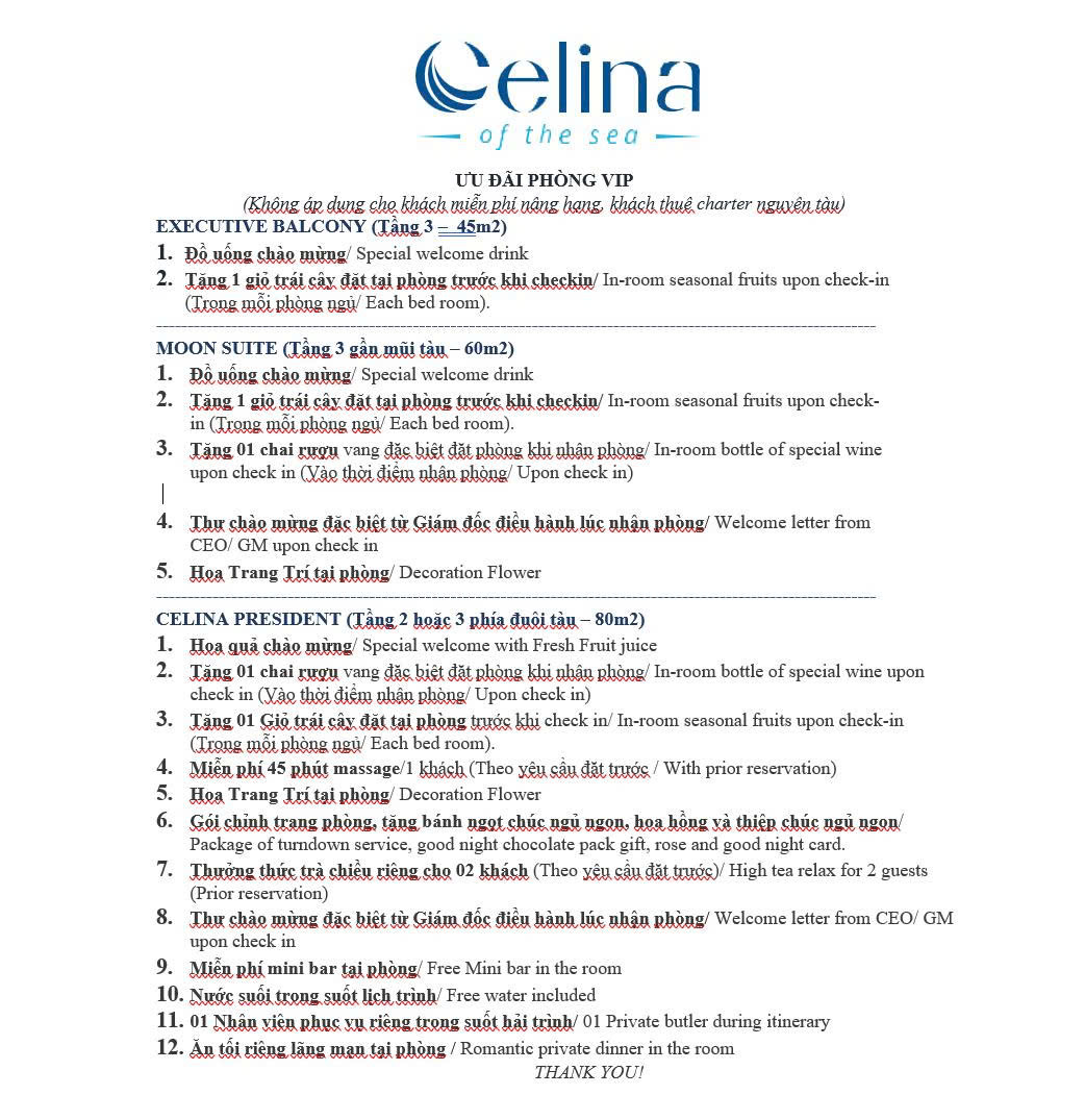Du thuyền Celina of the Sea (hay còn gọi là Celina of the Seas) là siêu du thuyền nghỉ đêm tiêu chuẩn 6 sao mới nhất năm 2026, được mệnh danh là “kiệt tác nổi” giữa kỳ quan thiên nhiên Vịnh Lan Hạ và Vịnh Hạ Long. Chính thức hạ thủy và đi vào vận hành từ tháng 02/2026, Celina of the Sea nhanh chóng trở thành lựa chọn hàng đầu cho du khách tìm kiếm trải nghiệm nghỉ dưỡng sang trọng, riêng tư và khác biệt. Đặt tour tại Your Vacation Travel để nhận ưu đãi chưa từng có, áp dụng nhân dịp khai trương du thuyền.