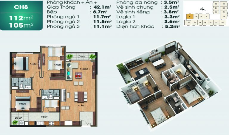 Thiết kế, diện tích từng loại căn hộ? Căn 2 phòng ngủ có diện tích 71m2 và 72m2 ; Căn 2 phòng ngủ + 1 phòng đa năng có diện tích 83m2 và 86m2; Căn 3 phòng ngủ + 1 đa năng có diện tích từ 102m2 đến 113m2.
